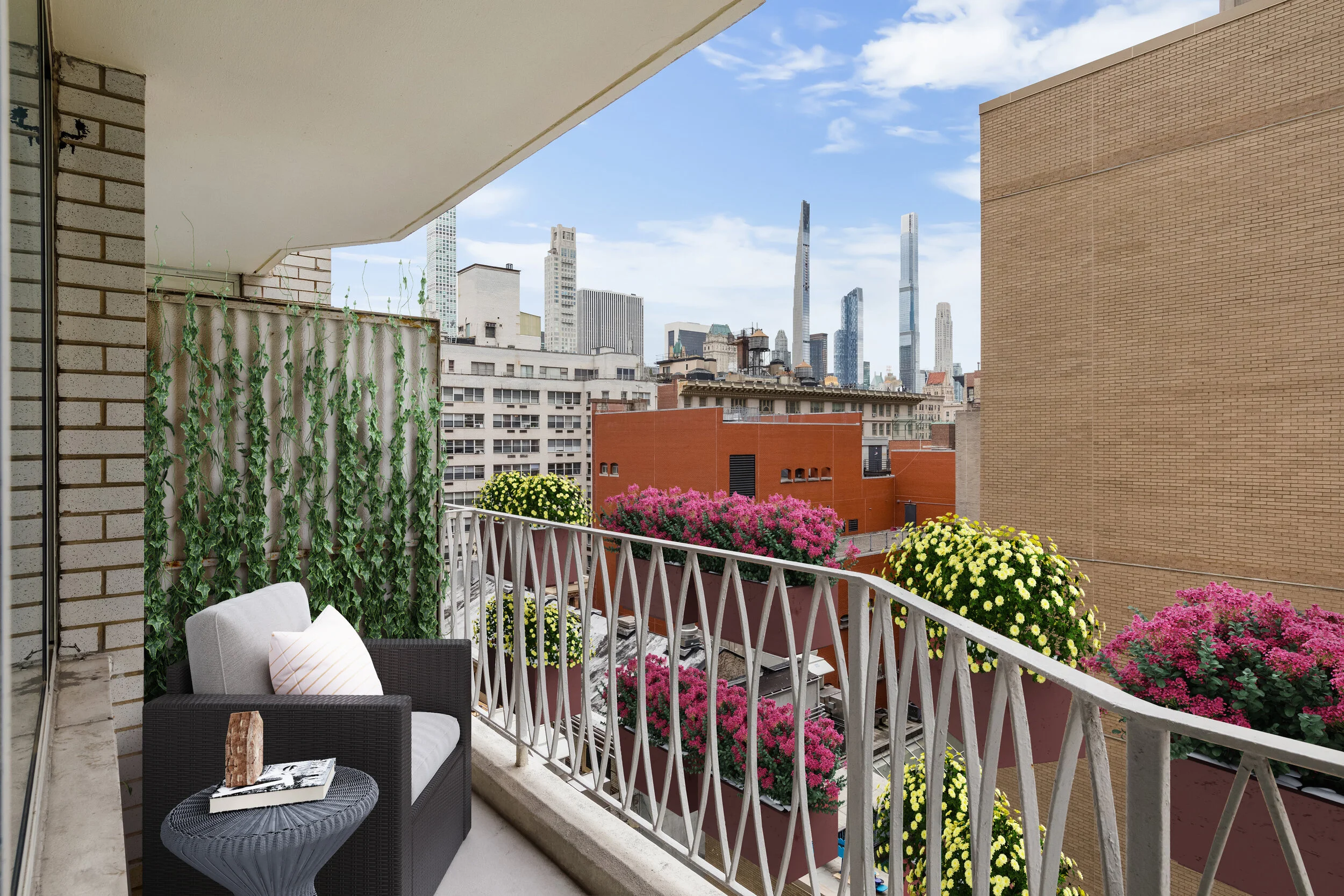 The West facing living room gets a surplus of sunlight and showcases a beautiful New York City skyline, showing you the skyscrapers on Billionaire's Row and Central Park’s surroundings. The balcony is perfect for your morning cup of coffee or evening cocktail, and gets plenty of sunlight for the New York City gardeners.